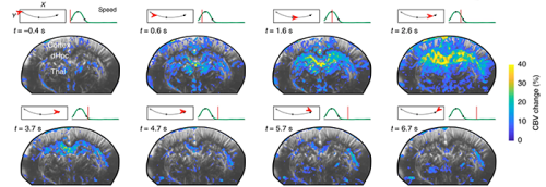 De plus, et de manière très surprenante, l’équipe a observé que deux épisodes de locomotion apparemment similaires en termes de vitesse de déplacement et de durée diffèrent drastiquement sur le plan vasculaire. Au début de la session d’enregistrement, le cortex répond fortement alors que l’hippocampe est relativement silencieux. Mais au fur et à mesure que l’animal accumule les épisodes de locomotion, le cortex semble passer le relais à l’hippocampe qui s’active de plus en plus intensément. Pourtant d’un point de vue extérieur, les deux essais sont similaires et l’activité électrique de l’hippocampe n’est que peu affectée ! Ceci montre que le lien entre activité vasculaire, électrique et comportement est complexe et que la répétition d’une tâche routinière comme les épisodes de locomotion peut générer des motifs d’activations très variables dans l’ensemble du cerveau.