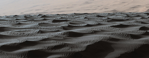 (3) Photographie d'une dune martienne du cratère Gale par le rover Curiosity de la NASA, cf. photojournal.jpl.nasa.gov/catalog/PIA20755. À la surface de celle-ci, on observe desgrandes’ rides de taille métrique et des petites dont la distance crête à crête est de l’ordre de 10 cm. Image Credit :