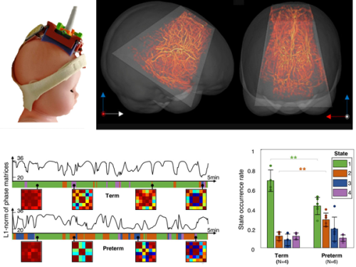Figure – Evaluation de la connectivité dynamique chez le nouveau-né grâce à l’imagerie fonctionnelle ultrasonore. Haut : la sonde ultrasonore est attachée sur la tête du bébé, et montée sur une platine motorisée permettant d’acquérir plusieurs plans d’imagerie. Bas gauche : évolution des états cérébraux au cours du temps, chez un bébé né à terme et chez un bébé prématuré. Bas droit : taux d’occurrence de chaque état cérébral, moyenné sur une cohorte de 4 bébés nés à terme, et 6 bébés prématurés.