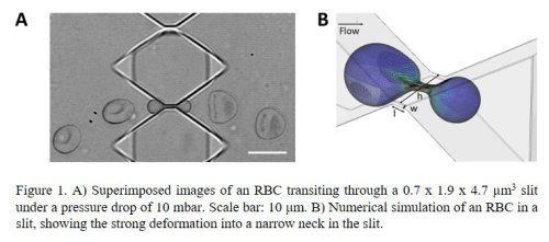 We developed a microfluidic device containing high aspect ratio slits (2-µm long, 5-µm high, < 1-µm wide), reproducing the physiological dimensions of the IESs [1] and validated a numerical model of RBCs passing through splenic-like slits [2]. We couple these approaches to understand retention rates, transit times and cell deformations of RBCs squeezing in splenic-like slits as a function of external parameters (slit dimensions, pressure drop, temperature).