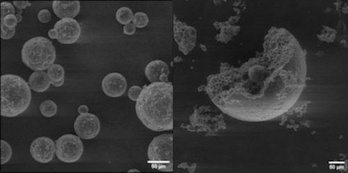 L'utilisation d'une huile polymérisable permet de créer de nouveaux matériaux d'une pureté extrême sans utiliser de solvant ni de tensioactif. Voici des images de microscopie électronique de globules multicœurs d’huile de soja epoxydée.