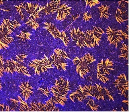 Imagerie de microscopie montrant les microtubules, NCD et KIF5B s'auto-organisant en motifs à haute densité de microtubules.