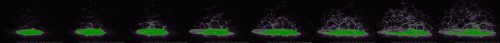 Nous présentons différentes configurations de transport de liquides via la phase continue d’une mousse aqueuse. Dans un premier temps, nous évaluons la capacité d’une mousse aqueuse à transporter une phase organique immiscible, telle qu’une huile silicone. Lorsque la mousse est stabilisée par des agents de surface à même de stabiliser les interfaces mixtes air/eau/huile, la mousse peut disperser, fractionner et aspirer la phase organique. Ce dernier point est illustré sur l’image ci-dessous où la dynamique d’imprégnation d’une mousse sèche par une huile (fluorescente) est observée. Lorsque l’huile est un agent démoussant, on observe la rupture en cascade de la mousse. Dans une deuxième partie, nous précisons certains mécanismes de coalescence en imbibant la mousse par de l’eau pure.