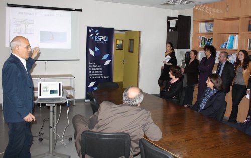 Ludwik Leibler présentant ses travaux sur la fermeture des plaies par une solution aqueuse de nanoparticules à Anne Hidalgo, Maire de Paris, en présence de Marie-Christine Lemardeley, présidente de l’ESPCI ParisTech et adjointe à la Maire en charge de l’enseignement supérieur, de la recherche et de la vie étudiante.