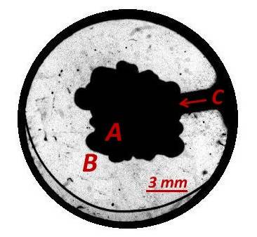 Top view of the experiment. A : Injected dyed water. B : Colloidal suspension. C : Injection tube.