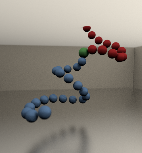 Figure 2 : Près d'une interface libre (tirets), une molécule (verte) peut se déplacer à l'aide d'une chaîne coopérative (bleue) dans le cœur du matériau, mais elle peut alternativement le faire au travers d'une chaîne (rouge) tronquée par l'interface – plus courte donc plus probable – ce qui accroît la mobilité de surface et réduit la température de transition vitreuse effective.