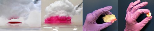 In the article, scientists from the «Science and Engineering of Soft Matter» laboratory (UMR 7615 ESPCI-CNRS-PSL) and from Saint Gobain explain two tricks they found to design the foams: the first one consists in using a polymer which forms a gel thanks to the addition of a cross-linker molecule. It allows for creating reversible links between the chains, thus forming a gellified chains network. Reversibility of the links is the key to shape and manipulate the foam. However the highly viscous gel doesn’t foam easily. To overcome this problem, researchers imagined a two steps foaming process: first they make the polymer foam without cross-linker, which is added only once the foam formed to gellify it.