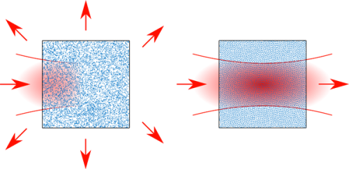 Droite : dans le cas d’un matériau hyperuniforme de même densité, le faisceau traverse le matériau sans distorsion, comme si le matériau était transparent.