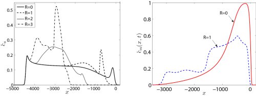 Figure : (left) Linear adsorption with solvent strength effect showing bimodal and distorted peaks. (right) Non-linear adsorption of Langmuir type showing rarefaction and shock layer formation.