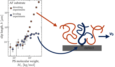 Au milieu du vingtième siècle, les matériaux polymères ont été produits de manière industrielle, et la miniaturisation de composants est devenue de plus en plus importante sur le plan technologique. Les molécules de polymère sont étendues dans l’espace, et ont tendance à se chevaucher fortement les unes les autres, à l’instar de longs spaghettis emmêlés après cuisson. Dans les années 60 et 70, Edwards et de Gennes ont montré que cet enchevêtrement moléculaire pouvait conférer à des liquides de polymères une viscosité énorme. Un exemple frappant est l’expérience de la goutte de poix à l’Université de Queensland, en Australie. En cours depuis 1927, cette expérience met en œuvre l’écoulement d’un liquide polymérique dont la viscosité est 100 milliards de fois supérieure à celle de l’eau ! Compte-tenu de la dépendance à la viscosité de l’équilibre des contraintes de Navier ci-dessus, la longueur de glissement devait clairement être réétudiée pour les liquides polymériques…