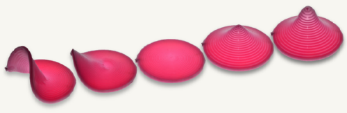 Actionnement d’un baromorphe de géométrie très simple : la variation de la pression interne induit le passage continu d’une chips à un plat à tajine, en passant par le disque plan.
