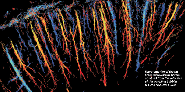 The scientists decided to use a contrast agent, microbubbles with a diameter of 3 µm, already used in medical diagnostics. As a part of several years of fruitful research collaboration with a team of neurobiologist led by Zsolt Lenkei, Inserm research director (ESPCI/CNRS), they injected the microbubbles in a rat vein and observed the living brain with their ultrasound device. The ultrafast acquisition rate of 5000 pictures per second allowed the very precise extraction of the individual signal emitted from each microbubble, an information usually drown into the noise of all the backscattered signals. Thus, their unique location can be well defined individually with micrometer precision during their travel in the brain vessels.