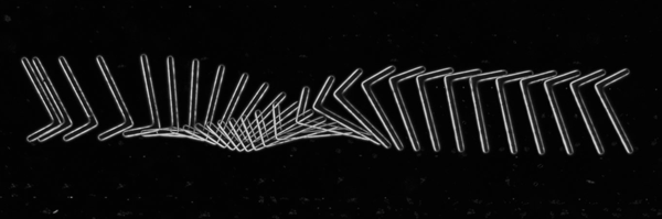 Fibre polymérique en forme de L (taille environ 200 microns) transportée dans un microcanal confiné (M. Daïeff, PMMH).