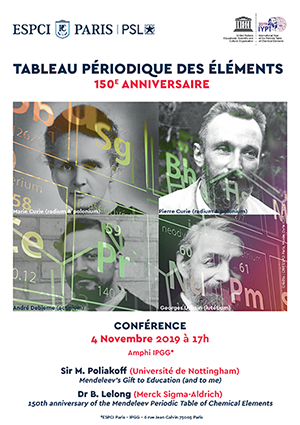 Le 4 novembre prochain à partir de 17H, nous aurons la chance d’accueillir à l’ESPCI un invité exceptionnel : Sir Martyn Poliakoff de l’Université de Nottingham qui viendra donner une conférence intitulée "Mendeleev’ gift to education (and to me)".