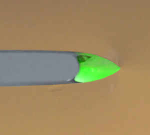 Une fissure se propage dans un biogel (gel de gélatine, coloré en beige). En déposant une goutte de solution de nanoparticules (colorée en vert) de silice sur le front de fissuration, la fissure est ralentie, voire stoppée.
