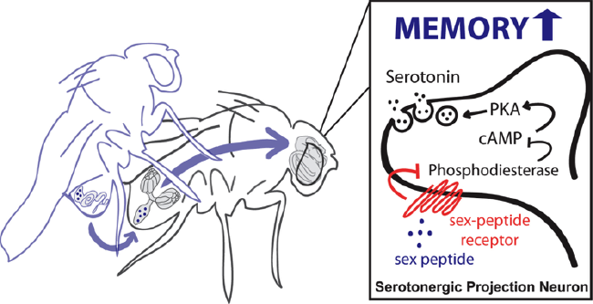 La reproduction chez les mammifères ou chez les insectes est souvent associée à des changements de comportement, comme lors de la prise alimentaire. En revanche l’impact sur les fonctions cognitives reste peu étudié. Les chercheurs se sont intéressés au cas de la mémoire à long terme aversive chez la drosophile, qui se forme suite à la présentation répétée d’une molécule odorante associée à petits chocs électriques. En comparant la mémoire des femelles vierges et des femelles après accouplement, ils ont montré que les performances de mémoire à long terme étaient bien meilleures chez les femelles fécondées.