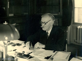 Paul Langevin dans son bureau à l'ESPCIEn effet, ce n’est pas un hasard si les descendants de Paul Langevin ont souhaité que ces archives soient conservées à l’Ecole. Ancien élève, puis directeur des études, professeur de physique et enfin directeur général, Paul Langevin a passé près de soixante ans, 58 très exactement, dans les murs de l’Ecole, interrompus par seulement deux courtes périodes : pendant ses études à l’ENS et au Laboratoire Cavendish près de J. J. Thomson, et après son arrestation pendant l’Occupation. C’est ici qu’il a eu comme professeur Pierre Curie. Il a été marqué par l’enseignement de son maître dont l’influence est présente dans ses travaux sur le magnétisme et le sonar. En tant que directeur, il y habite et il a son laboratoire particulier, alors même qu’il est en même temps professeur au Collège de France. C’est dans son laboratoire de l’ESPCI qu’il a fait les premiers essais du sonar. C’est encore ici, dans son bureau de l’ESPCI, qu’il a reçu Einstein avec qui il se lie d’une grande amitié, à l’occasion de l’une des visites de ce dernier à Paris.