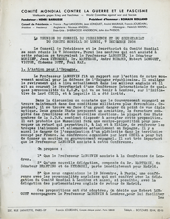 Conseil de Présidence du Comité mondial contre la guerre et le fascisme. Langevin appelé à se rendre à Londres pour défendre la cause des républicains espagnols