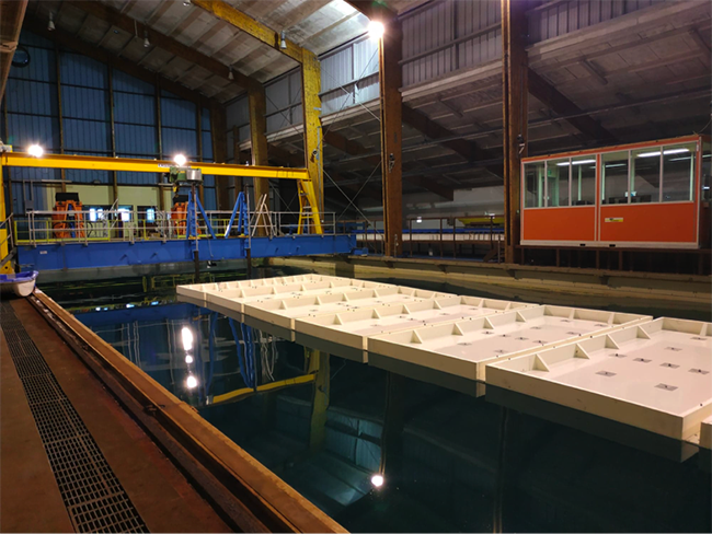 Comment se propagent les ondes de la houle sous la banquise ? « La question peut paraitre hors-sujet mais à l’origine, nous cherchions à étudier ces phénomènes physiques naturels pour valider des modèles de prédiction, confie Antonin Eddi, chercheur CNRS au laboratoire de physique et mécanique des milieux hétérogènes à l’ESPCI. Nous avons fait des expériences modèles dans un aquarium de notre laboratoire à Paris avec une sorte de membrane élastique en guise de banquise. C’est là que nous avons observé qu’elle pouvait, selon son matériau et sa forme, rediriger l’énergie de la houle ou au contraire la concentrer ». L’équipe a vite songé à toutes les applications que ces propriétés pouvaient offrir ! Contrôler grâce à ces plaques la direction de propagation de la houle pourrait permettre non seulement de protéger les zones de travaux en mer, comme par exemple lors des phases d’installation de dispositifs d’énergie marines renouvelables (EMR), mais aussi de concentrer l’énergie des vagues pour optimiser son exploitation par des systèmes de récupération de l’énergie des vagues. Un brevet a été déposé et la SATT Lutech (Paris) est chargée de la montée en puissance et de la valorisation du projet. Ils financent pour cela une partie des essais et le post-doctorat de Vincent Cognet arrivé à l’Ifremer en mars 2019 pour travailler sur ce projet en partenariat avec l’ESPCI.