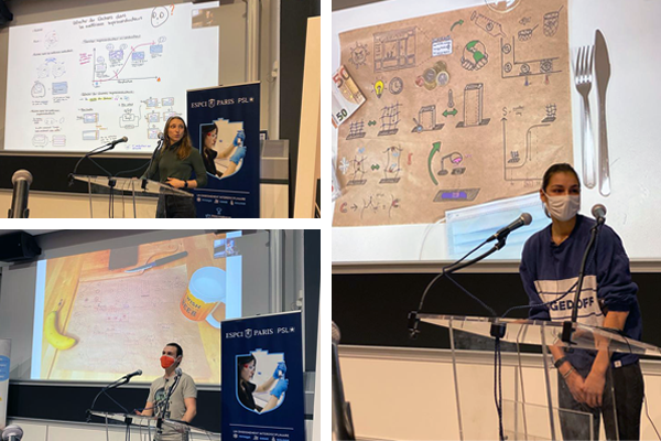 A l’ESPCI, un nouveau format s’est développé ces dernières années, pour permettre aux jeunes scientifiques de prendre du recul, et d’expliquer leurs travaux : les chroniques doctorales. Grâce à l’accompagnement de l’ESPGG, ils vont s’appuyer sur un support original : une présentation Prezi qui fait office de nappe. L’enjeu : imaginer présenter sa thèse au détour d’un déjeuner , avec comme seul support le set de table et les objets à disposition.