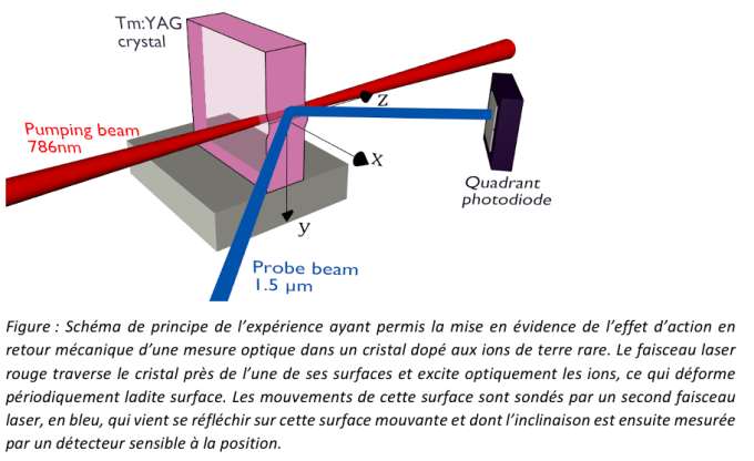 Dans des travaux antérieurs portant sur un cristal particulier, le Tm:YAG, les chercheurs avaient remarqué que la mesure continue de l’état des atomes représentait une estimation extrêmement sensible des contraintes appliquées localement au cristal [1]. En suivant les principes fondamentaux de la mécanique quantique, une telle mesure devrait donc nécessairement s’accompagner d’un effet d’action en retour, c’est à dire de l’apparition d’une contrainte au voisinage des atomes illuminés. Cette hypothèse était très audacieuse : l’évaluation d’un tel effet, jamais observé, renvoyait des valeurs très faibles qui rendraient son observation illusoire, voire impossible.