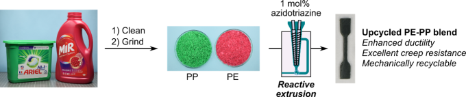 Dans ce contexte, une équipe de chercheurs dirigée par Nathan Van Zee (chargé de recherche au CNRS) et Renaud Nicolaÿ (professeur à l’ESPCI Paris - PSL) au laboratoire C3M a découvert une nouvelle stratégie prometteuse pour valoriser les mélanges de polyoléfines en matériaux haute performance. Comme récemment rapporté dans le Journal of the American Chemical Society, ce processus repose sur la chimie fascinante des azotures de triazine, des molécules capables de former de nouveaux liens chimiques avec les polyoléfines à haute température. Thomas Vialon, ingénieur de l’ESPCI Paris – PSL - qui est le premier auteur de cette étude et a récemment soutenu sa thèse de doctorat - a exploité cette chimie en utilisant l’extrusion réactive, un procédé sans solvant utilisé dans l’industrie pour transformer les polymères. Les mélanges de PE et de PP ainsi valorisés sont des réseaux polymères dynamiques qui présentent d’excellentes propriétés en traction, de résistance au fluage et de recyclabilité mécanique. Ce procédé s’est également avéré applicable aux objets récupérés dans la vie quotidienne.