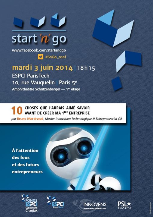 Créée en 2013, Start’n’Go est une association de l’ESPCI ParisTech visant à promouvoir l’innovation et l’entreprenariat auprès des élèves-ingénieurs. Parmi ses missions, Start’n’Go s’engage à rapprocher les étudiants des entrepreneurs pour leur donner le goût d’entreprendre. Pour cela nous organisons, en collaboration avec InnovENS (ENS Ulm), un cycle de conférences : Secrets d’Entrepreneurs.
