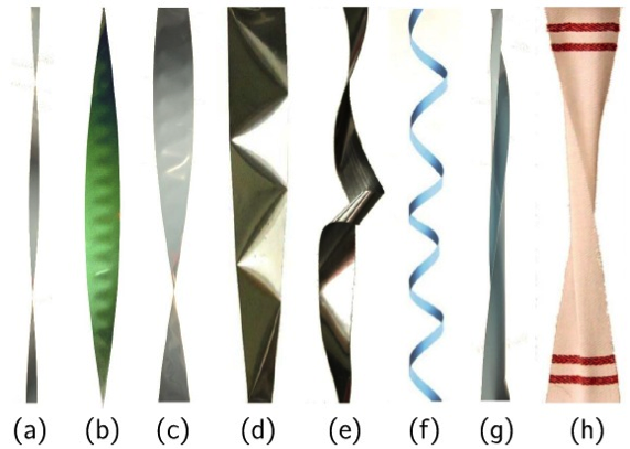 Figure 1 Typical morphologies of ribbons subjected to twist and stretching : (a) helicoid, (b,c) longitudinally wrinkled helicoid, (d) creased helicoid, (e) formation of loops and selfcontact zones, (f) cylindrical wrapping, (g) transverse buckling and (h) twisted towel shows transverse buckling/wrinkling (from Ref.[2]).