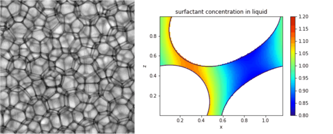 Liquid foams are assemblies of gas bubbles in a soapy solution, found in many applications from cosmetics to oil drilling. The nature of surfactants changes the properties of the liquid-gas interfaces, and consequently the macroscopic properties of the foam like its stability and rheology. However, the flow mechanisms at the scale of the bubble and soap films are not yet fully understood.