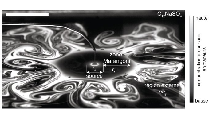 Je montrerai comment nous avons relié les propriétés de l’écoulement de Marangoni à aux propriétés des tensioactifs (solubilité, présence d’impuretés, géométrie du système, etc). Ce lien entre physicochimie et hydrodynamique permet de caractériser rapidement la thermodynamique en solution des tensioactifs. Je présenterai ensuite une étude concernant la structure de l’écoulement de surface [3], pour terminer par des résultats récents concernant les écoulements de Marangoni sur de l’eau salée.