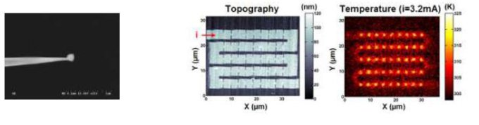 Right : topography and thermal images measured on a nanostructured microwire, hot spots are visible at every constriction.